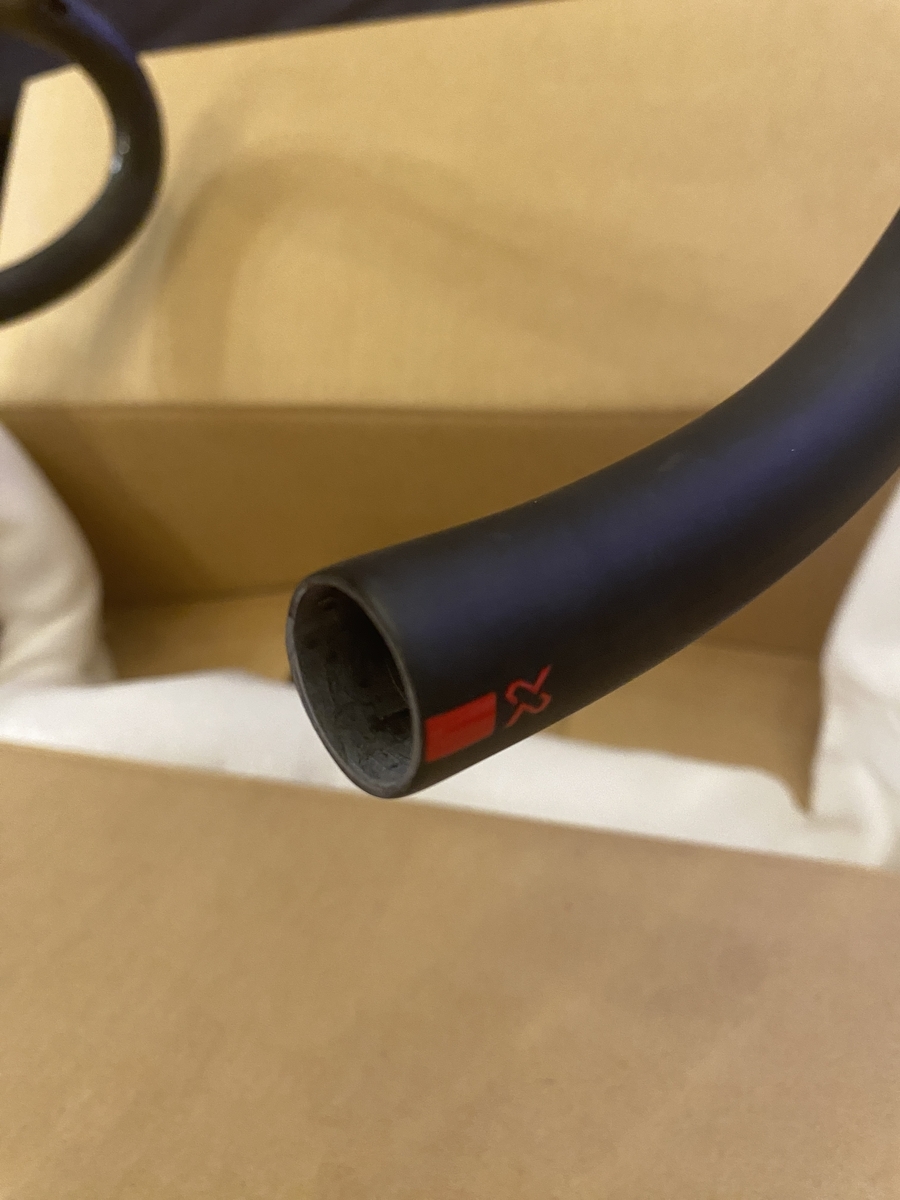 このハンドルはドロップ部分が5mmだけ外側にフレア(ハノ字)しています。下が400mmなので上部は390mmと言う少し変速的な企画ですが、管理人的には今回の決め手になった1つです。